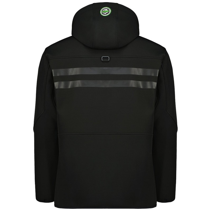 Softshellová funkční bunda s kapucí, vysoký límec, zapínání na zip.