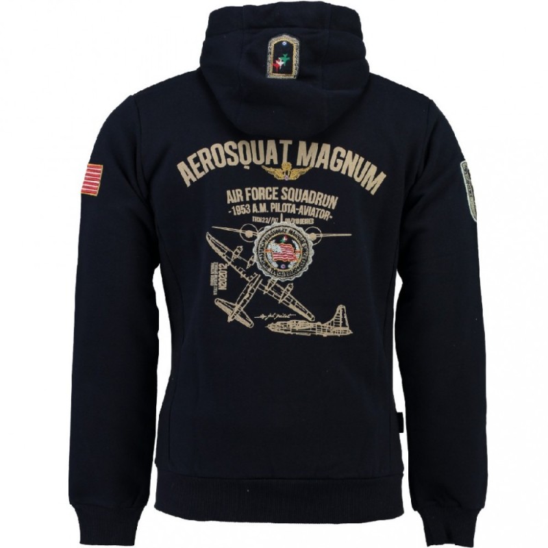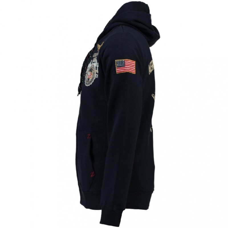 GEOGRAPHICAL NORWAY pánská mikina s kapucí FAERO se zapínáním na zip. Je zdobená na hrudi potisky a nášivkami, loga a nápisy Geographical Norway. Nášivky má na rukávech a kapuci. Vzadu na zádech je zdobena potisky letadel. Je vybavena dvěma bočními kapsami. Nabízíme i v nadměrných velikostech.